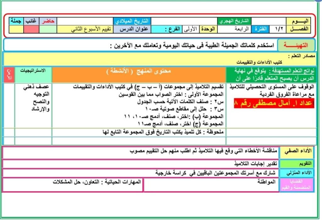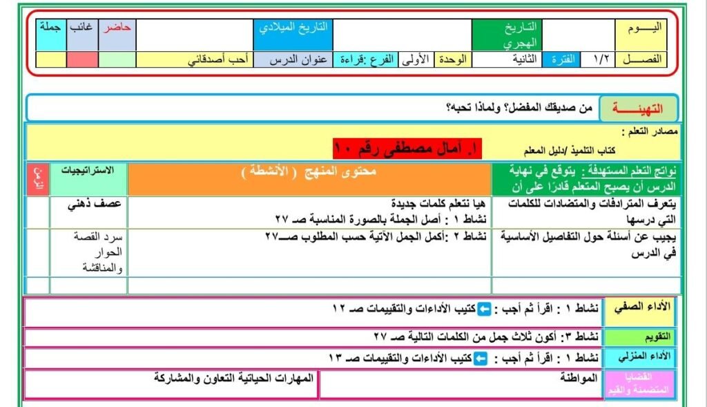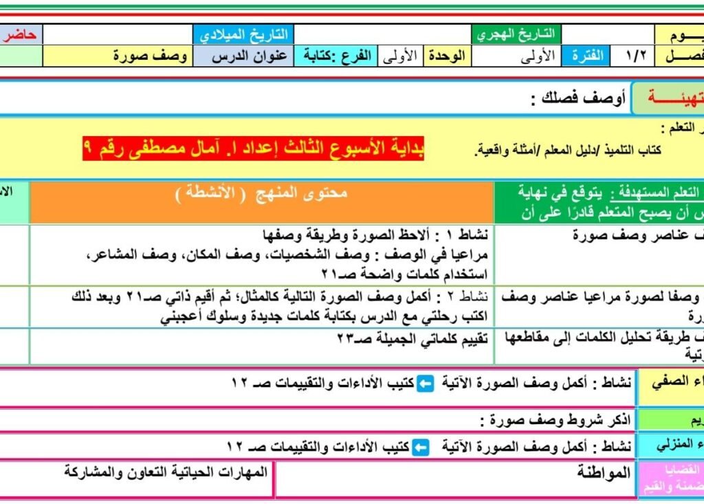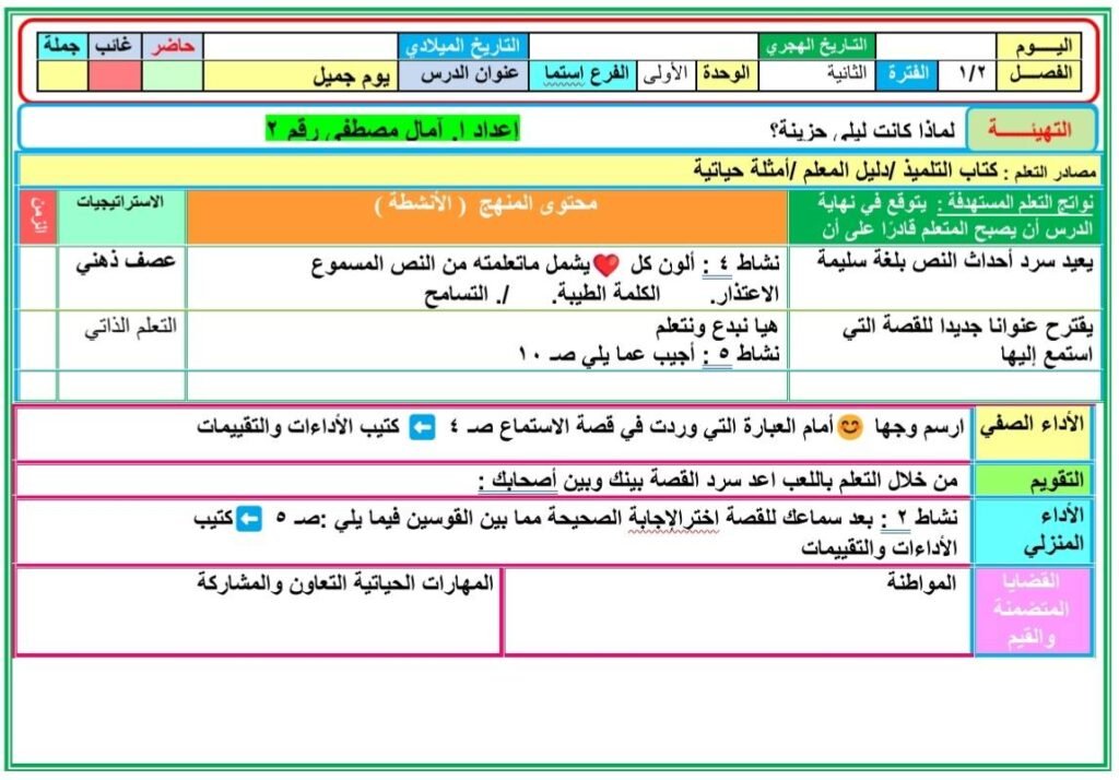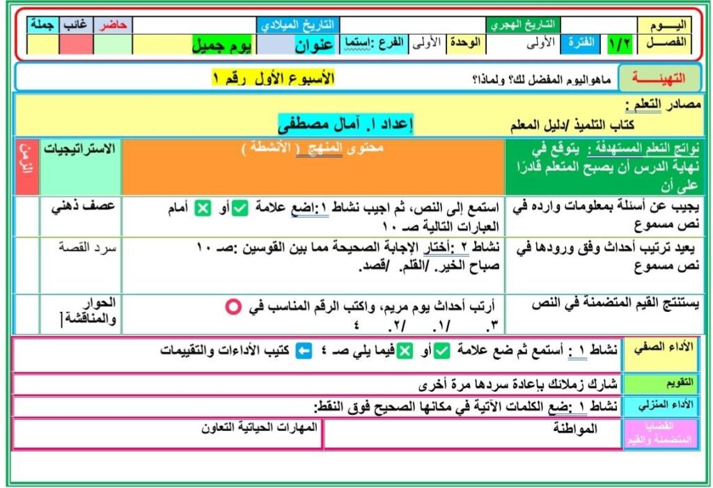 تحضير دروس اللغة العربية الصف الثاني الابتدائي المنهج المطور الجديد2025 2026 الأسبوع الأول والثاني والثالث التقييمات من إعداد ا. آمال مصطفى ، حيث تضمن تحضير الدرس الأول : يوم جميل (استماع) – الصف الثاني الابتدائي