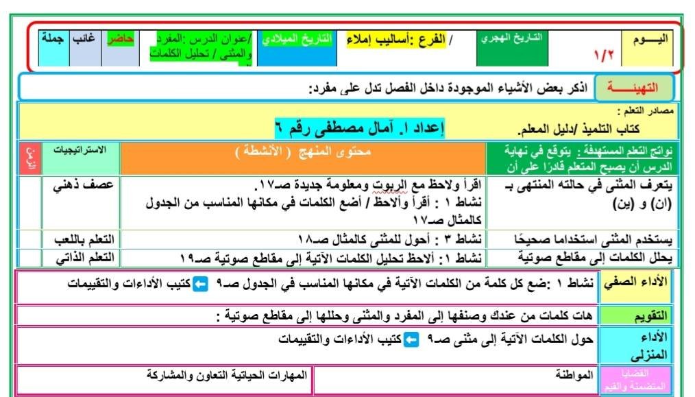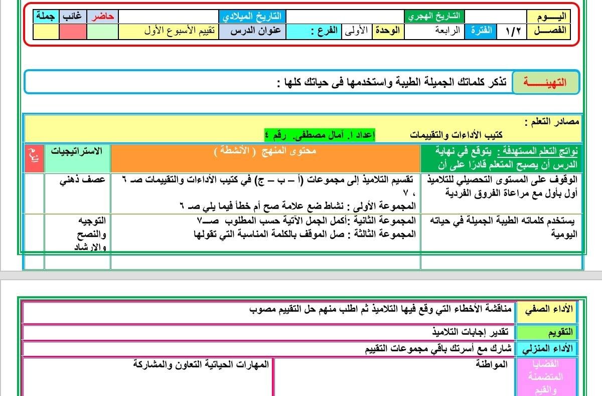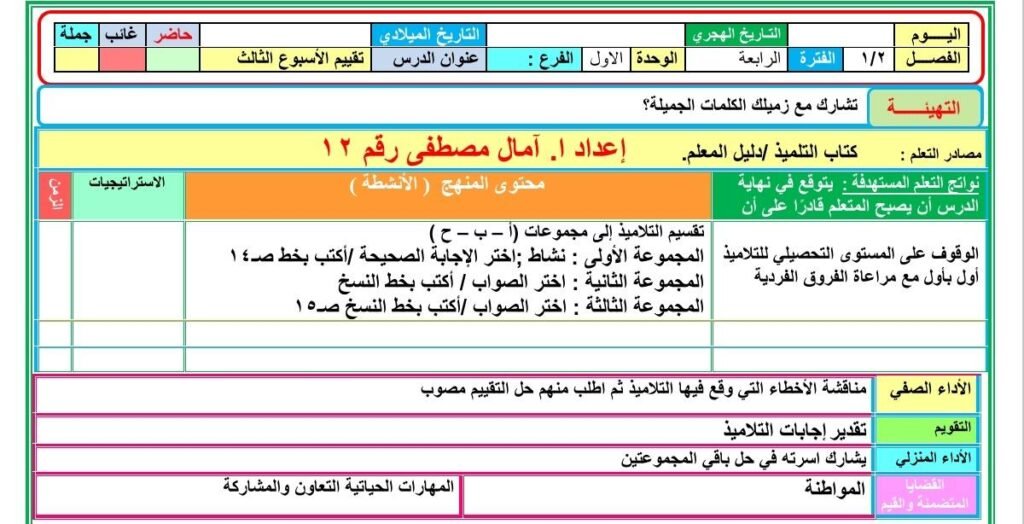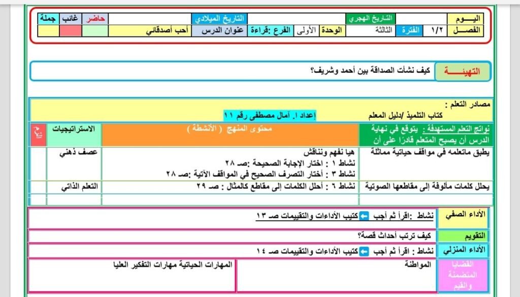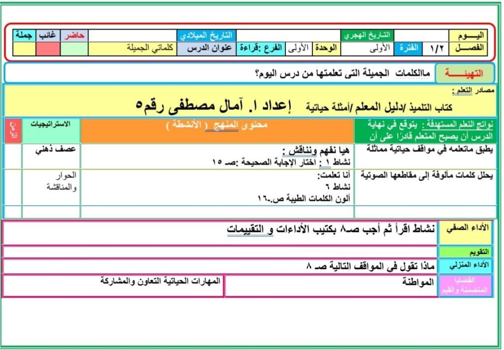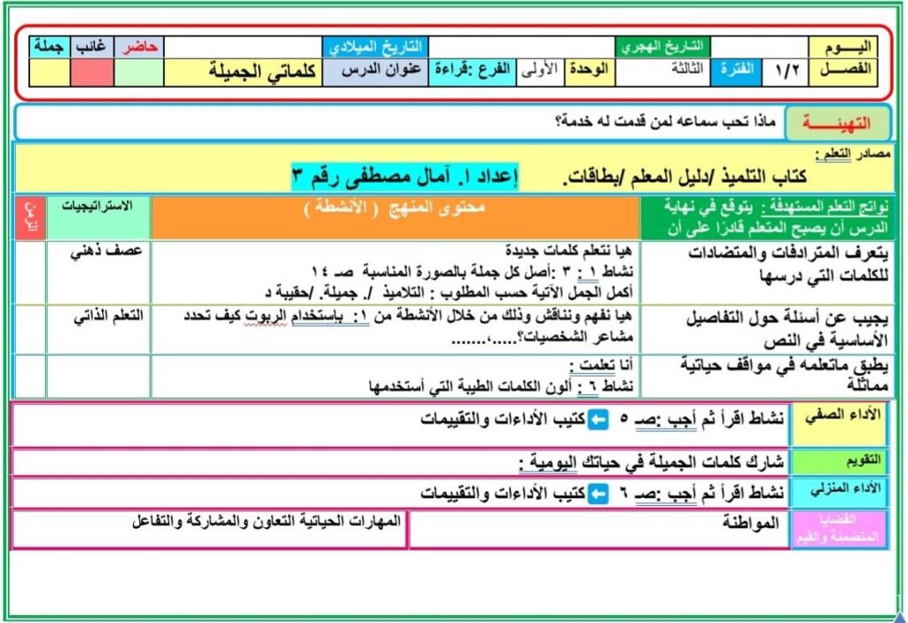 تحضير دروس اللغة العربية الصف الثاني الابتدائي المنهج المطور الجديد2025 2026 الأسبوع الأول والثاني والثالث التقييمات من إعداد ا. آمال مصطفى ، حيث تضمن تحضير الدرس الأول : يوم جميل (استماع) – الصف الثاني الابتدائي