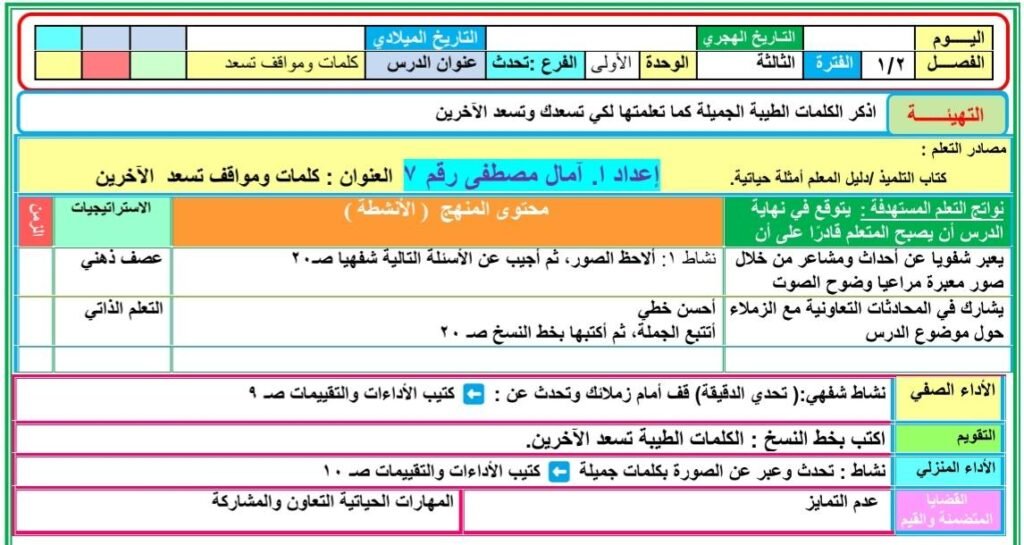 وبالنسبة للفصل الأول، الوحدة الأولى، فرع التحدث، عنوان الدرس: كلمات ومواقف تسعد