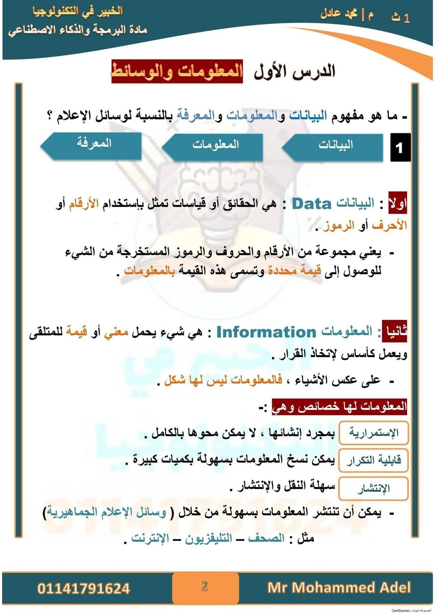 وتناول شرح الفصل الاول والثاني ماده البرمجه والذكاء الاصطناعي للصف الأول الثانوي الفصل الدراسي الأول