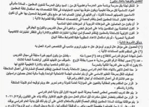 8- تنتهي مدة العمل بانتهاء خطة العام الدراسى ويجوز الاستعانة ب المعلمين بنظام الحصة المشاركة فى أعمال الملاحظة الصفوف النقل بمرحلة التعليم الاساسى على أن يتم احتساب الجلسة الامتحانية الواحدة بقيمة مالية تعادل حصتين دراسيتين و عدم الاشتراك فى أعمال الامتحانات أو لجان النظام والمراقبة.